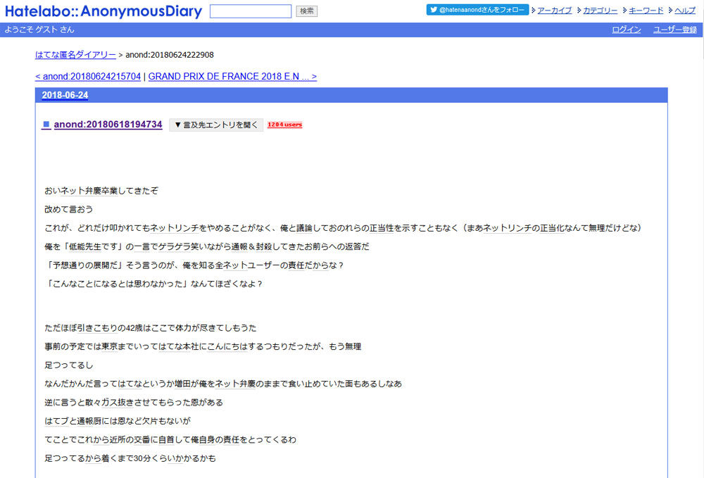 実は自転車で逃亡してから警察に出頭する3~4時間ほどの間、犯人はインターネットブログに記事を投稿しており、犯行声明をしていた可能性が浮上。犯人にしかわかりえない表現や情報があるとされており、無関係の者がいたずらで記事を更新したようには思えない内容となっている 。 (抜粋)